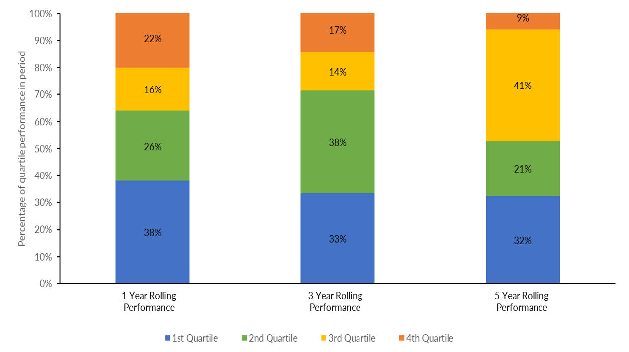 The chart below shows the percentage of times, looking back through history, that the Distribution Fund’s rolling 1, 3 and 5 year performance has been in the 1st (top), 2nd, 3rd or 4th (bottom) quartile relative to its sector, the IA Mixed Investment 40-85% Shares Sector. Rolling periods begin at each quarter end since Distribution’s launch, starting from the 30/06/2012.