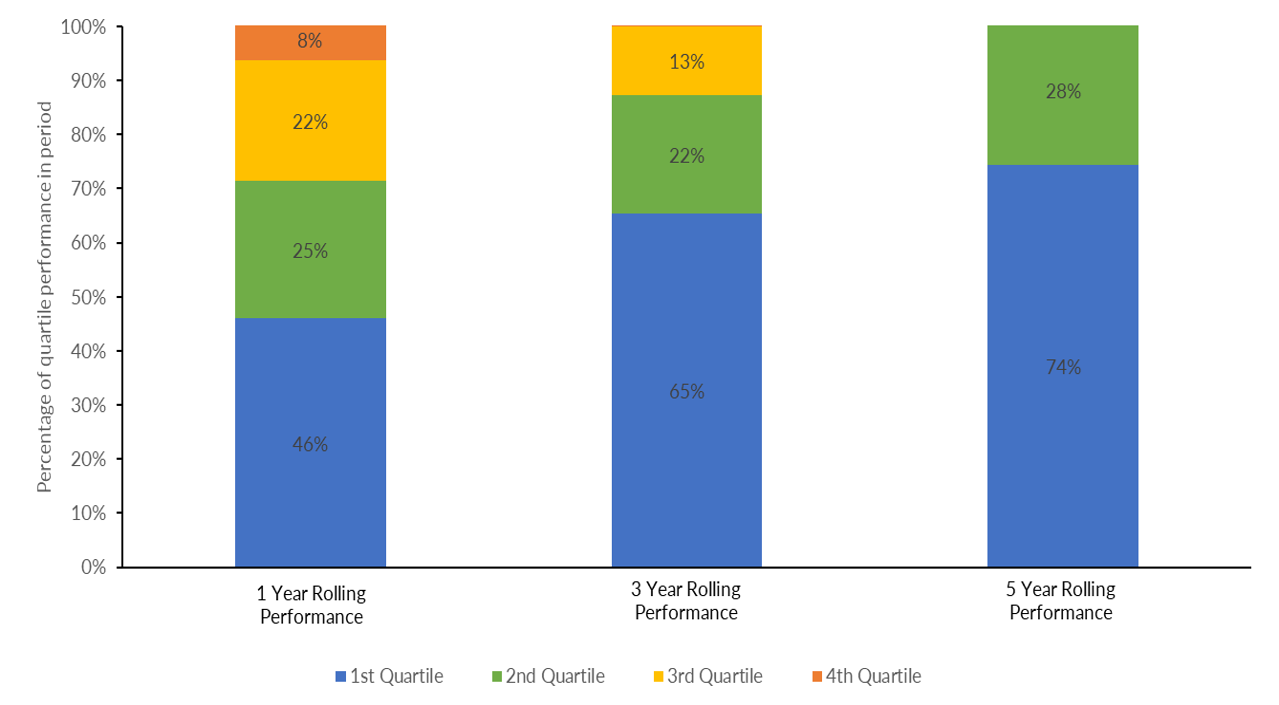 The chart below shows the percentage of times, looking back through history, that the Vanbrugh Fund’s rolling 1, 3 and 5 year performance has been in the 1st (top), 2nd, 3rd or 4th (bottom) quartile relative to its sector, the IA Mixed Investment 20-60% Shares Sector. Rolling periods begin at each quarter end since Vanbrugh’s launch, starting from the 31/03/2009.