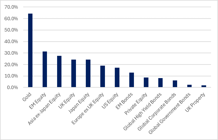 - Non-US value equities: Our low allocation to US equities has been a howling headwind for a number of years, but in 2026 turned into a gentle but refreshing tailwind with the US underperforming most other major markets over the course of the year. In sterling terms Europe was +26.2%, EM +24.4% and Japan +16.0%, whilst the much-despised UK market delivered total returns of 24.2%. Cheap starting valuations, it seems, can help drive stellar returns even when sentiment and flows are at rock bottom. UK equities in particular benefited from heightened M&A and buybacks as trade buyers, private equity and the companies themselves moved to take advantage of the bargains on offer, even as domestic wealth managers continued to flee. The Funds also benefited from the bias towards value managers, a long-standing tilt in the portfolios predicated on relative valuation where the premium multiple applied to quality-growth stocks has been compressing ever since the heady and unsustainable hights hit in late 2021. AI related stocks have, of course, continued to perform well, but seem to be pricing in lots of good news and ignoring the fact that the range of probable outcomes for many of the theme’s dominant stocks is unusually wide. The moral of 2025’s story is that it was possible to make great returns without taking the valuation risk and heroic blue-sky assumptions associated with the AI trade.