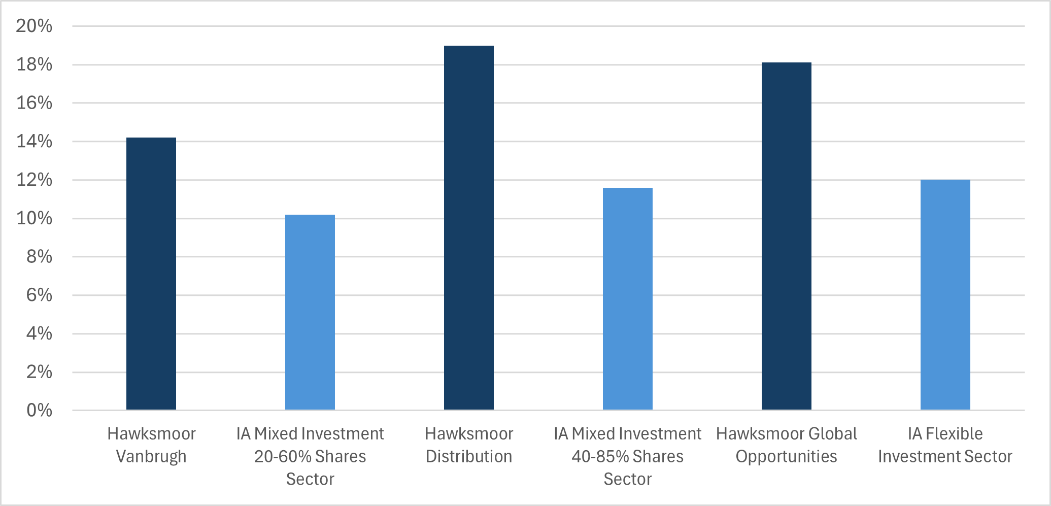 In this spirit, we review how the Hawksmoor Funds fared in 2025. Pleasingly Vanbrugh, Distribution and Global Opportunities all generated healthily positive returns of 14.2%, 19.0% and 18.1%, respectively. All 3 delivered first quartile performance and were meaningfully ahead of their respective IA sectors with Vanbrugh outperforming by 4.0%, Distribution by 7.4% and Global Opportunities by 6.1%.