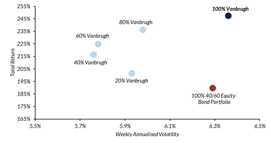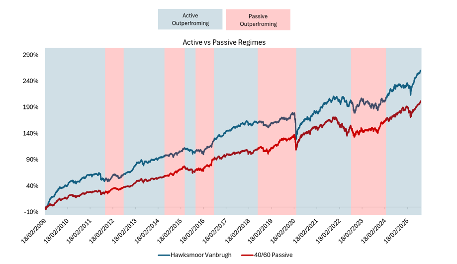 We have been talking about the merits of blending to potential investors for some years and specifically the improved risk-adjusted returns that can be harvested by combining passive multi-asset solutions with truly active ones such as those managed by Hawksmoor. A picture (or chart) says a thousand words.