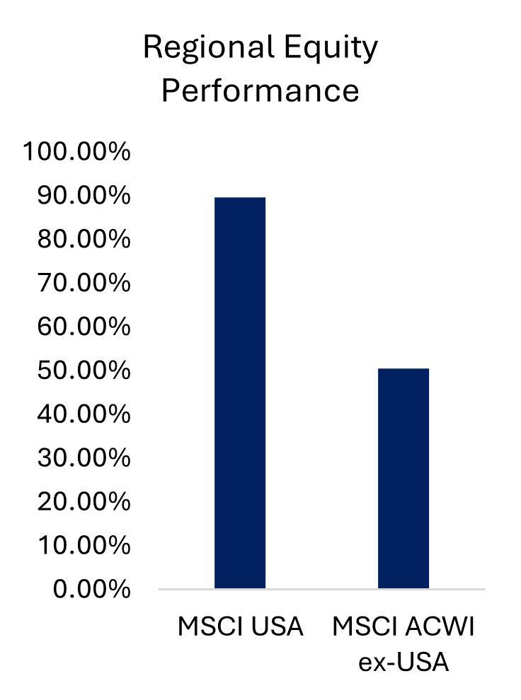 We recently compared the 5-year performance of our Vanbrugh fund with that of a well-known provider of passive multi-asset solutions (Vanguard). The latter runs with a home bias, but weights are otherwise relatively static driven by the slow evolution of exposure within global market cap weighted indices such as MSCI ACWI. Its portfolio construction methodology, despite the home bias, inevitably results in a significant exposure to US equities which represent over two thirds of world equity indices today. In a world where wealth managers and other domestic investors seem to be abandoning the home bias, we’ve also included in the charts below another well-known provider of passive multi-asset solutions (BlackRock) which tends to be managed more in line with market-cap weighted indices and has even more of the portfolio in US equities as a result. Vanbrugh (and our other multi-asset funds), in contrast, has a low allocation to US equities which is informed by our disciplined and well-established valuation conscious investment process. As the charts below demonstrate, having lower exposure to US equities has been a major headwind to our relative returns when considering the extent to which the US has outperformed other regional markets. Despite these headwinds, Vanbrugh is still well ahead of the passive solutions of choice.