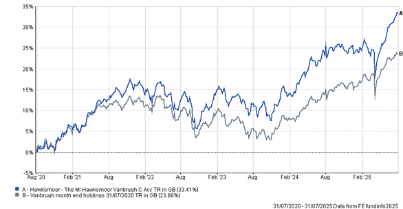 Broad investment universe: The Hawksmoor Funds fish in a deep and broad pool. Yes, we own equities and bonds, but we also have significant exposure to a host of alternative assets including illiquid private markets which we own via closed-ended investment trusts. These sorts of assets cannot be accessed via trackers or, by extension, passive multi-asset funds. Having a broader investment universe ultimately improves the probability of finding individual investments that can contribute to the return objectives of the Fund at any given point in the cycle, whilst also bringing diversification benefits. Infrastructure and other real assets, for example, have added 180bps to Vanbrugh’s performance YTD. Material exposure to gold miners which form a tiny part of global equity indies have added a further 160bps. As benchmark agnostic, unconstrained investors we are happy to take conviction positions in these sorts of smaller, more niche areas if justified by return prospects, allowing them to be significant drivers of overall fund returns.